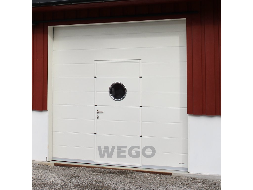 Sektionales Garagentor mit Tür, Weiß RAL 9010, WOODGRAIN, mittlere Sicke